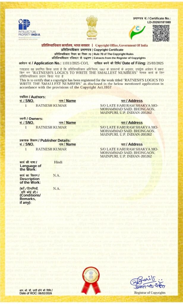 INDC Network : मैनपुरी, उत्तर प्रदेश : जनपद मैनपुरी के भोगांव निवासी गणित शिक्षक एवं स्वतंत्र शोधकर्ता रत्नेश कुमार की पुस्तक “सबसे छोटी संख्याएँ लिखने के रत्नेश के तर्क (RATNESH’S LOGICS TO WRITE THE SMALLEST NUMBERS)” को कठिन जांच प्रक्रिया से गुजरने के बाद लगभग एक वर्ष पश्चात भारत सरकार से कॉपीराइट पंजीकरण प्राप्त हुआ है। यह कॉपीराइट संरक्षण अंतरराष्ट्रीय स्तर पर भी मान्य है और विश्व के लगभग 181 देशों में प्रभावी माना जाता है।
